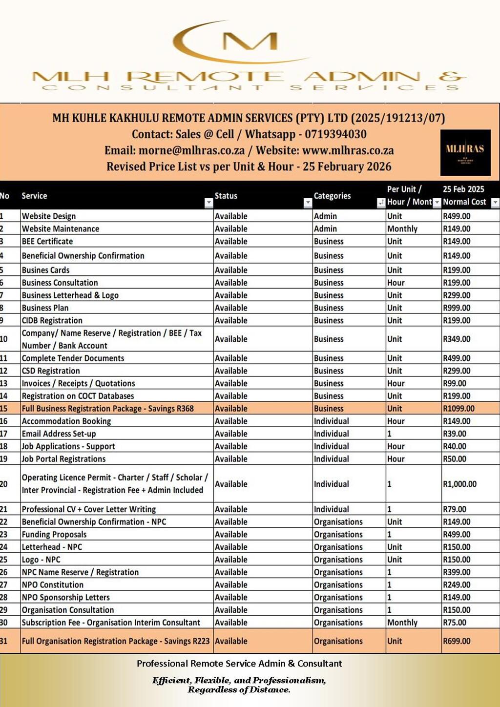 MLHRAS offers a comprehensive range of administrative and consulting services including data entry, business compliance registrations, mailing list updates, business plans, tender applications, SMME training and workshops.