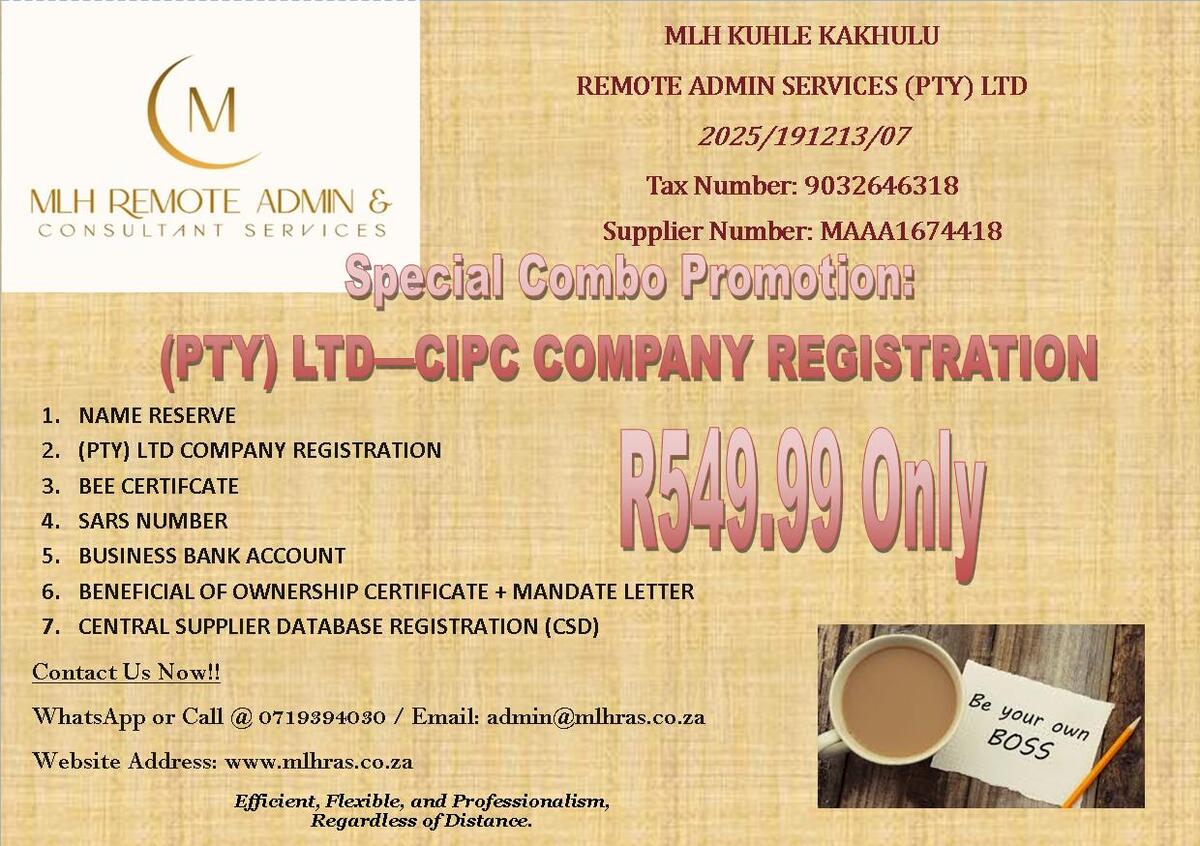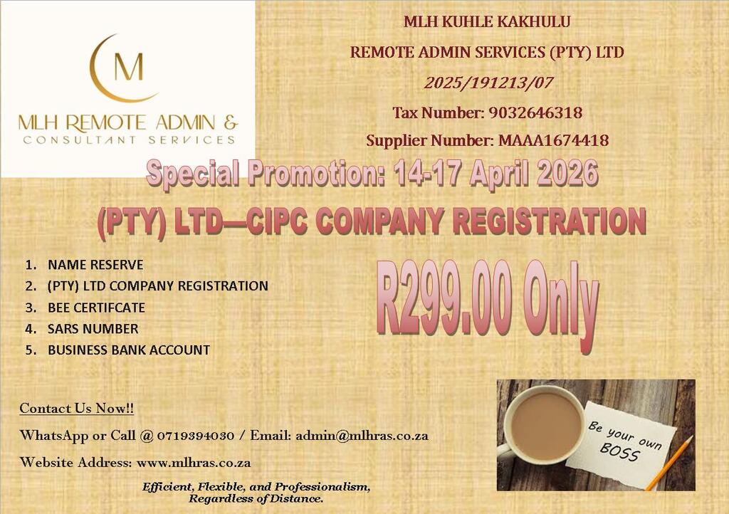 Company / Organisation Compliances, Consultation, Admin & Support | 1. Legal Entity Compliance (CIPC & Identification) 2. Tax Compliance (SARS) 3. Financial Compliance (Banking) 4. B-BBEE Compliance 5. Other Mandatory & Specialized Compliances 6. Maintenance & Ongoing Compliance 7. Business Consultation – Office Hours | R199.00 |